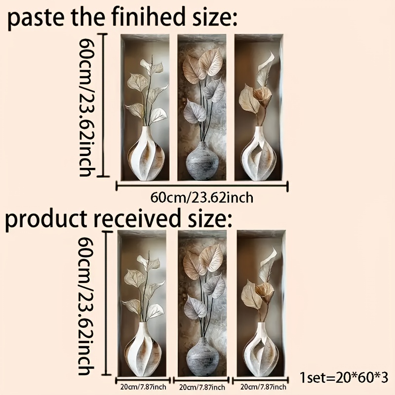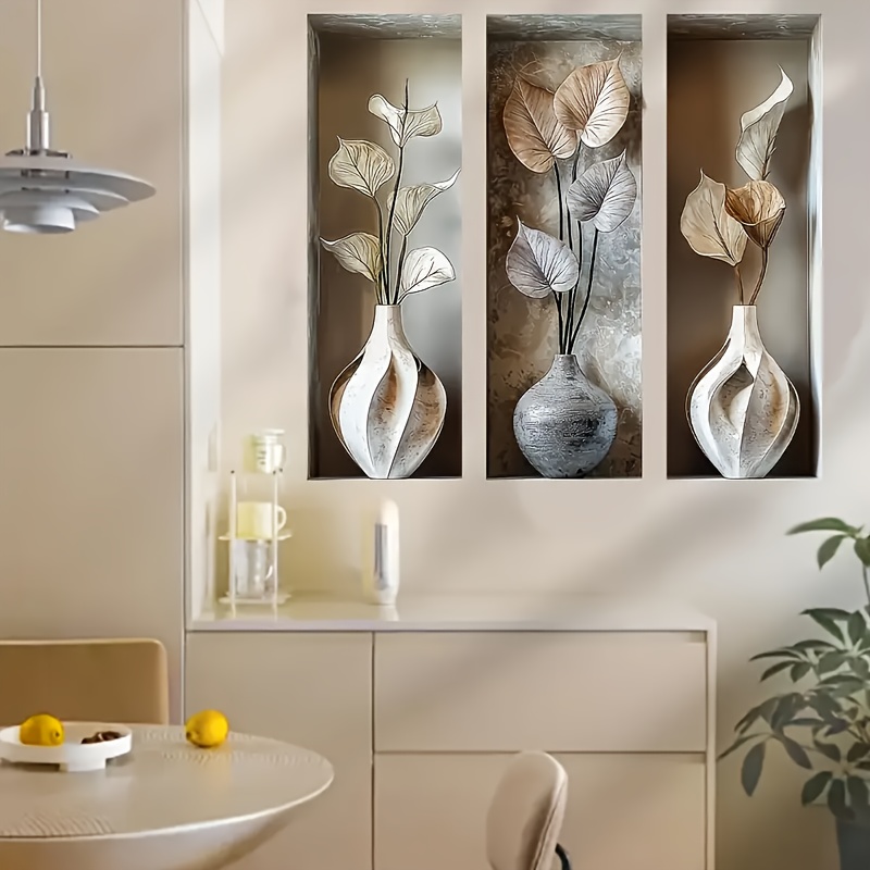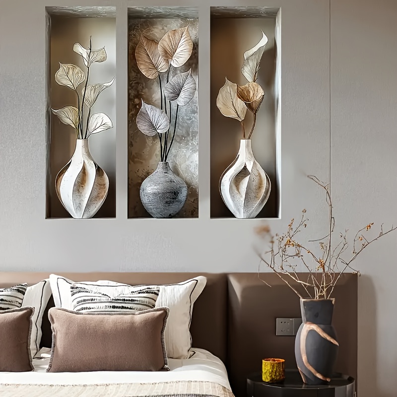 Add a touch of modern elegance to your home with this beautifully designed 3-piece wall decor set. Featuring graceful leaf motifs and textured vase elements, these vinyl stickers bring a minimalist yet artistic vibe to any space. The Nordic-inspired design blends effortlessly with a variety of interior styles, making it perfect for enhancing living rooms, bedrooms, study areas, or staircases.