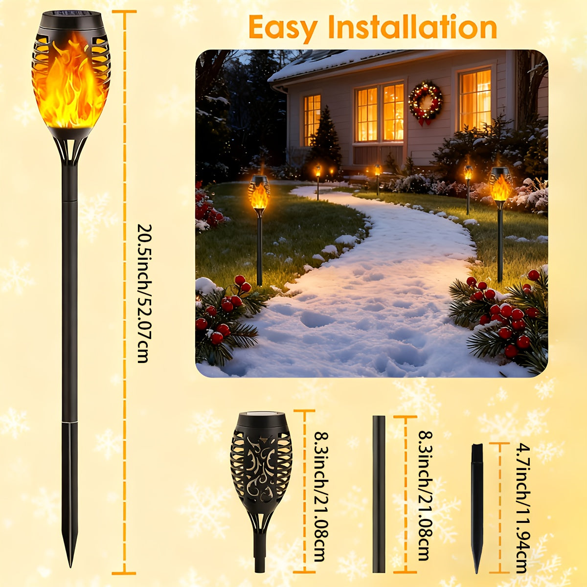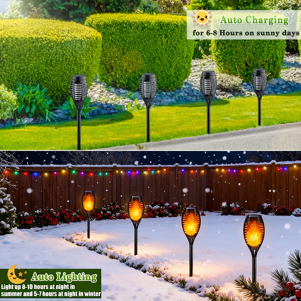 With automatic dusk-to-dawn operation, durable IP65 waterproof protection, and energy-efficient solar charging, these outdoor flame lights offer beauty and convenience all year long.