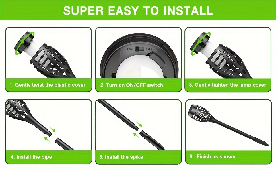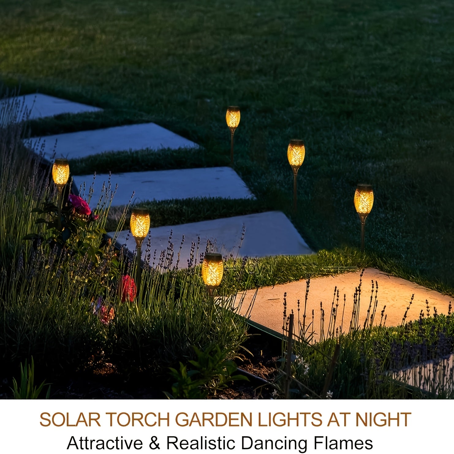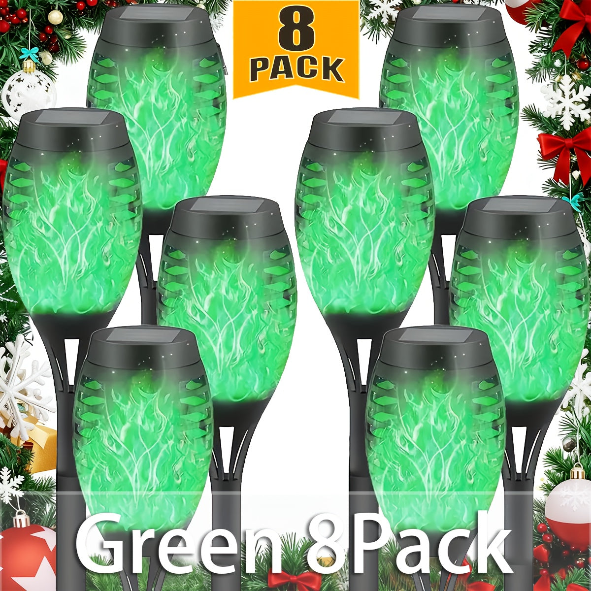 Illuminate your outdoor space with this 8-pack of Solar Flickering Flame Torch Lights, designed to add warmth, charm, and elegance to any setting. These solar-powered luces solares create a stunning, realistic flame effect—perfect for patios, gardens, lawns, courtyards, wedding events, and holiday decor.