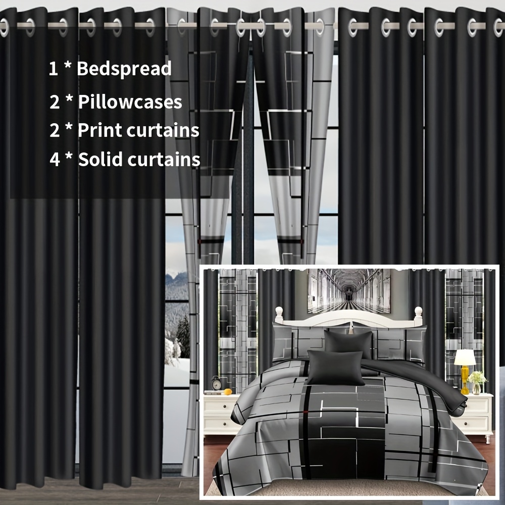 9-Piece Grey Bedding & Curtain Set – Includes Bed Cover, Pillowcases, Printed & Solid Curtains – Queen/King/Cal King Size