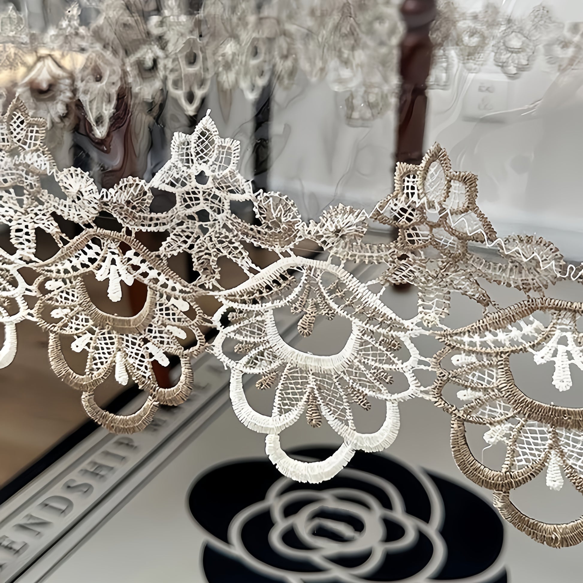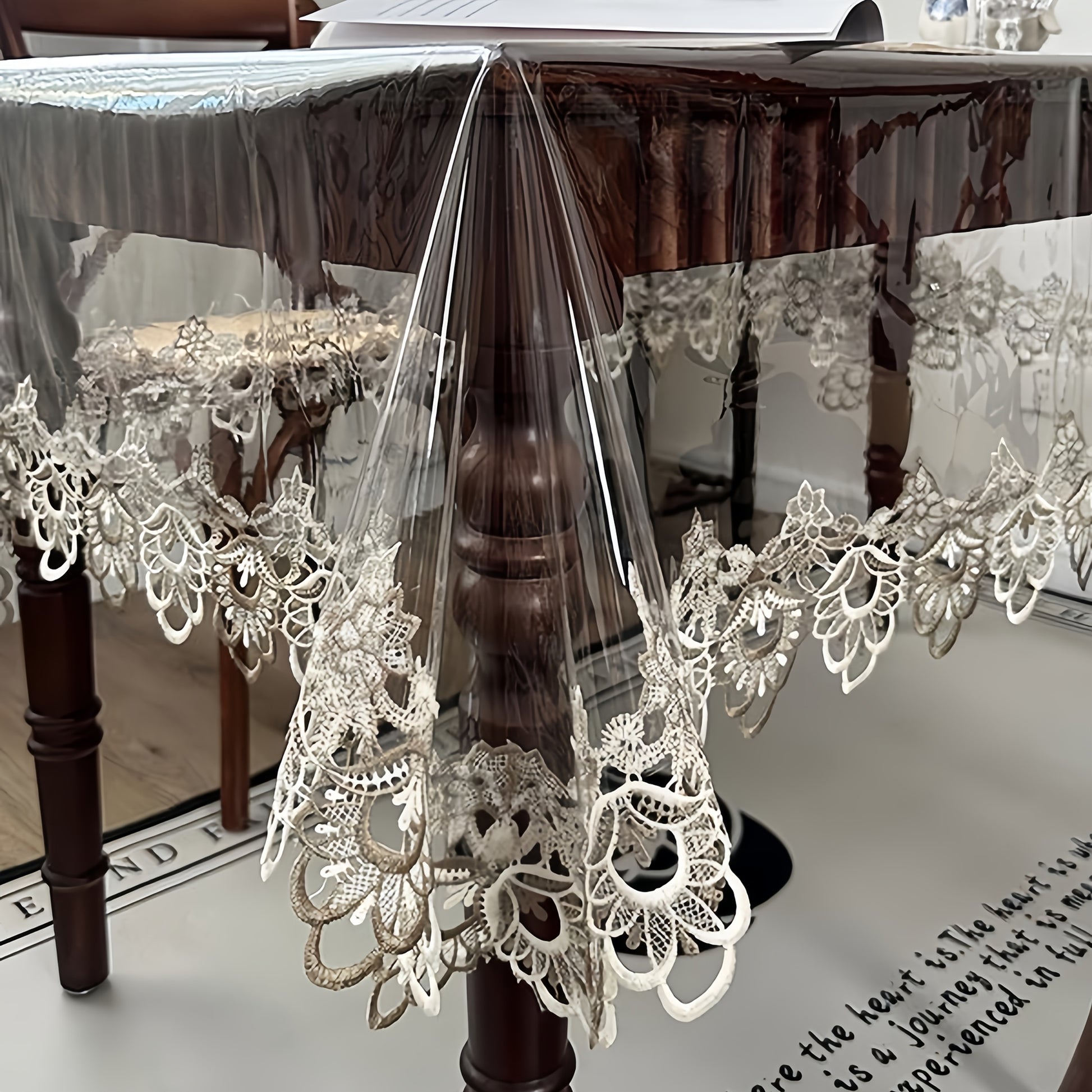 Enhance your dining, coffee, or tea table with this exquisite clear PVC tablecloth featuring intricate lace embroidery. The delicate floral patterns add a touch of sophistication and charm, making it a perfect choice for everyday home decor or special occasions.