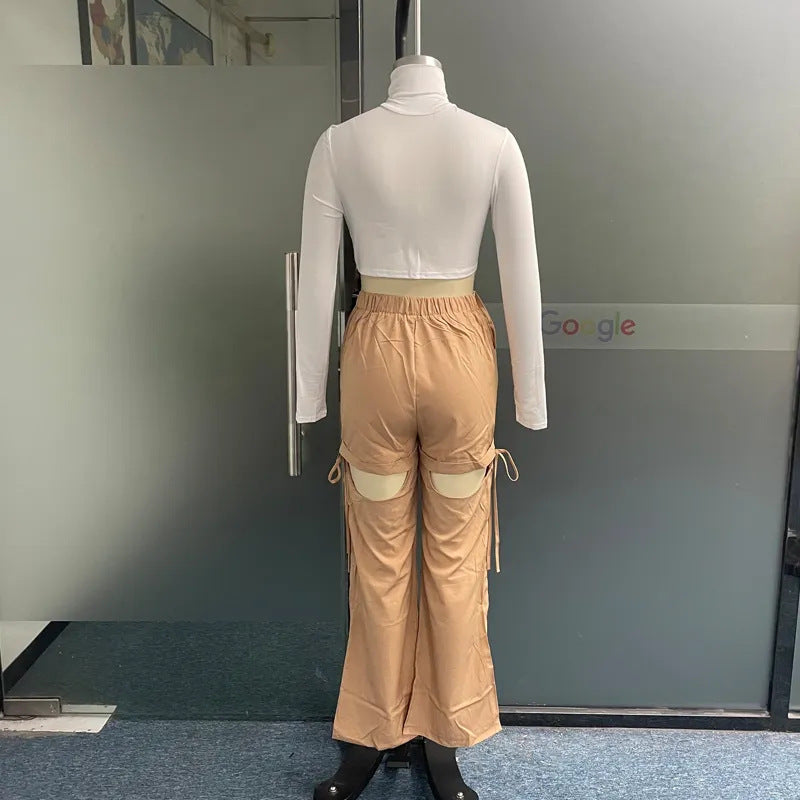 High Neck Solid Color Bottoming Shirt Design Sense Fashion Drawstring Overalls Suit