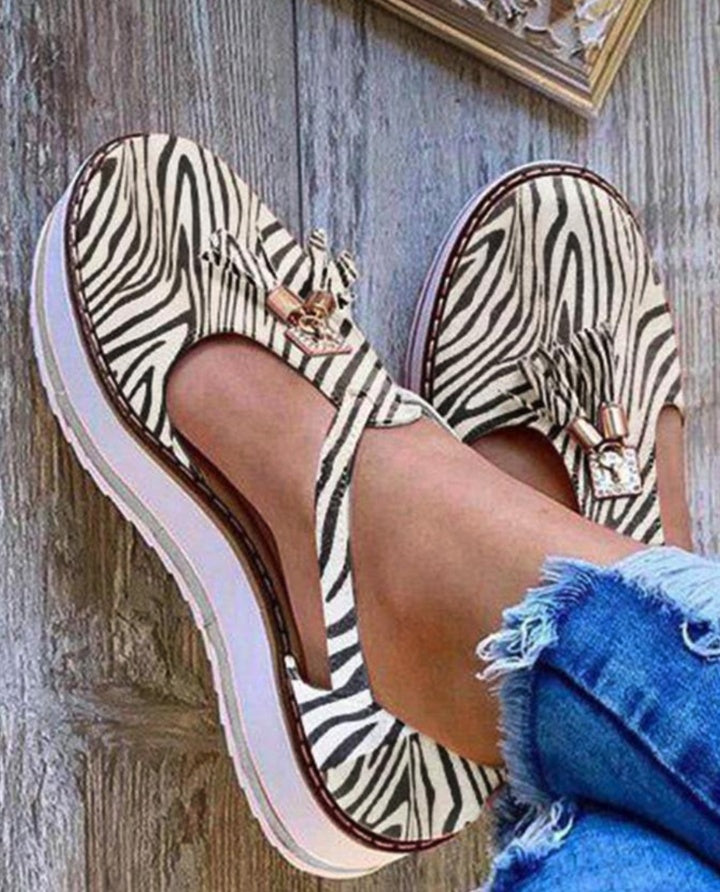Features: Fringe embellishments, platform sole, adjustable ankle strap