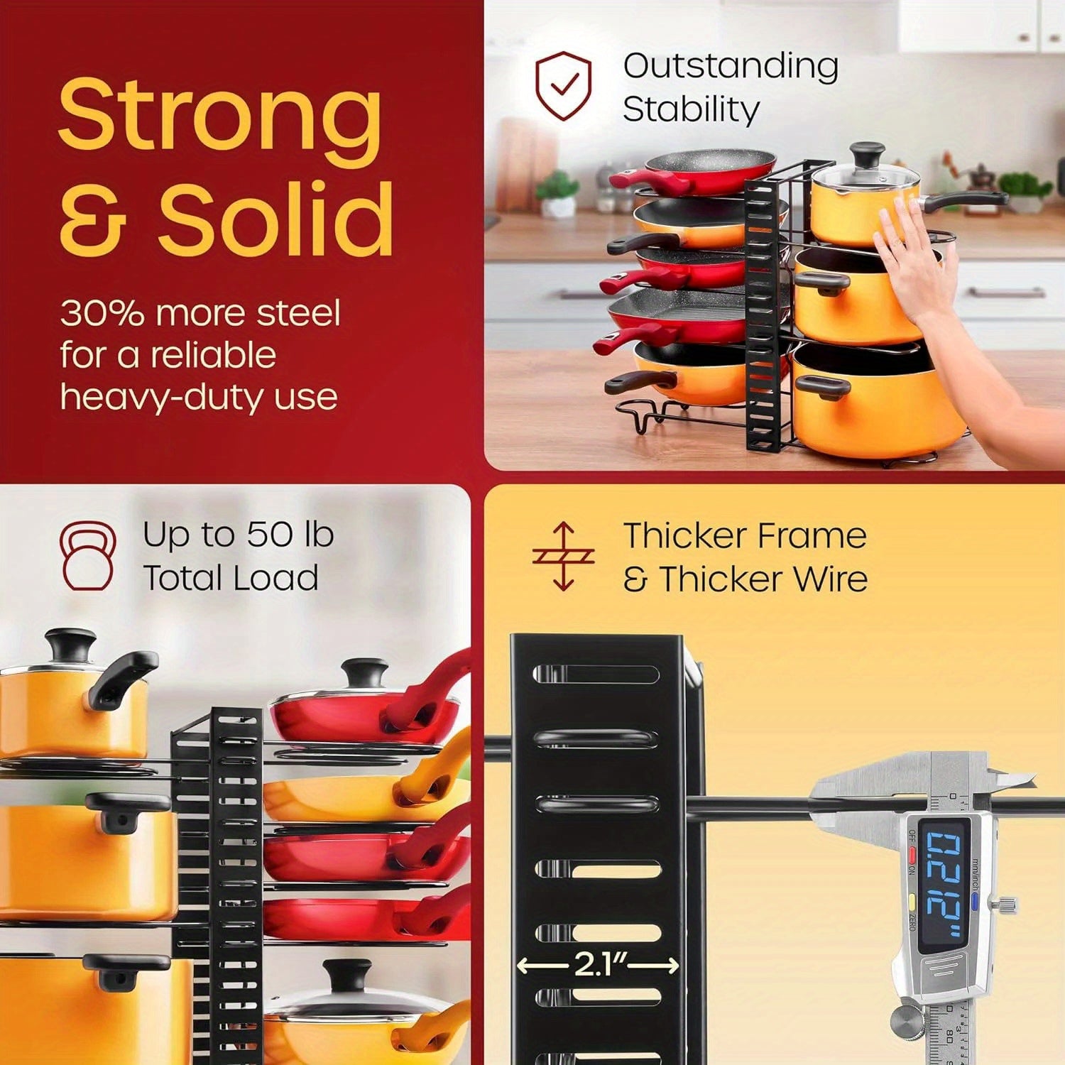 Adjustable 8-Tier Design: Accommodates pots, pans, lids, and kitchenware of all sizes. The height of each tier can be adjusted to suit your needs.