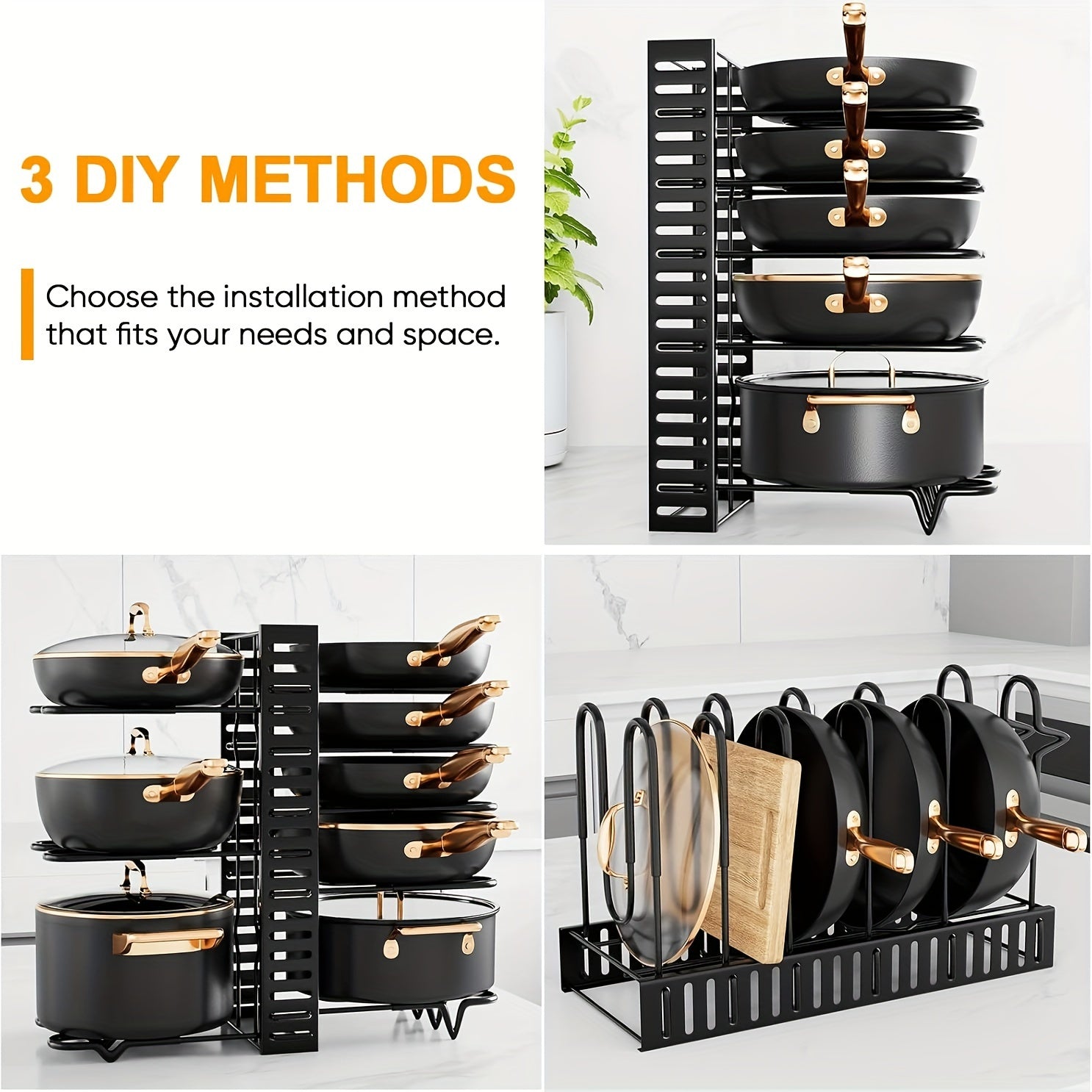 Maximize your kitchen space and keep your cookware neatly organized with this versatile 8-Tier Pot and Pan Organizer. Designed for durability and customization, this organizer fits perfectly inside cabinets, on countertops, or in pantry spaces.