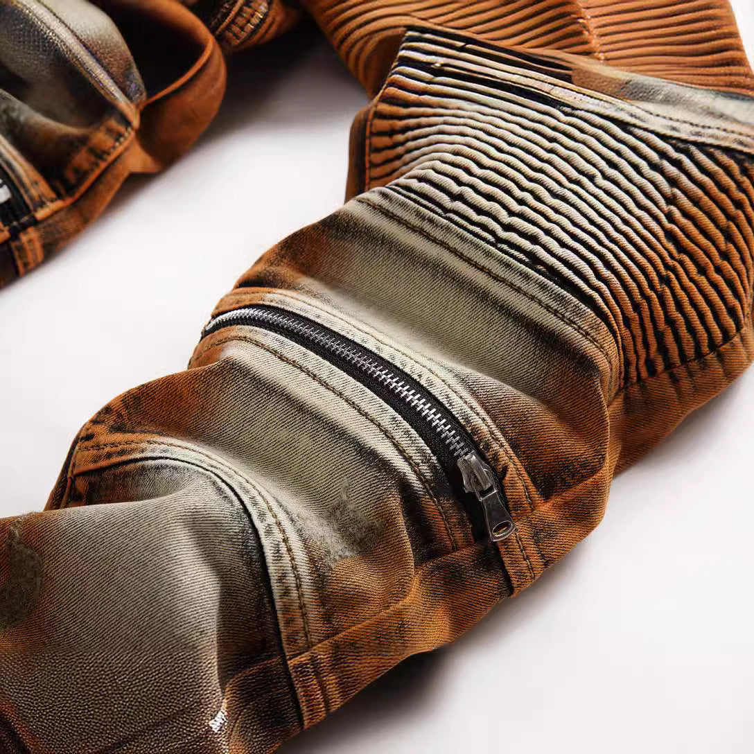Distinguished by bold zipper decorations, dyed finishes, and personalized detailing, these pants exude rebellious energy and urban style. Whether you're cruising the streets or hitting the club, these jeans deliver high-impact style with attitude.