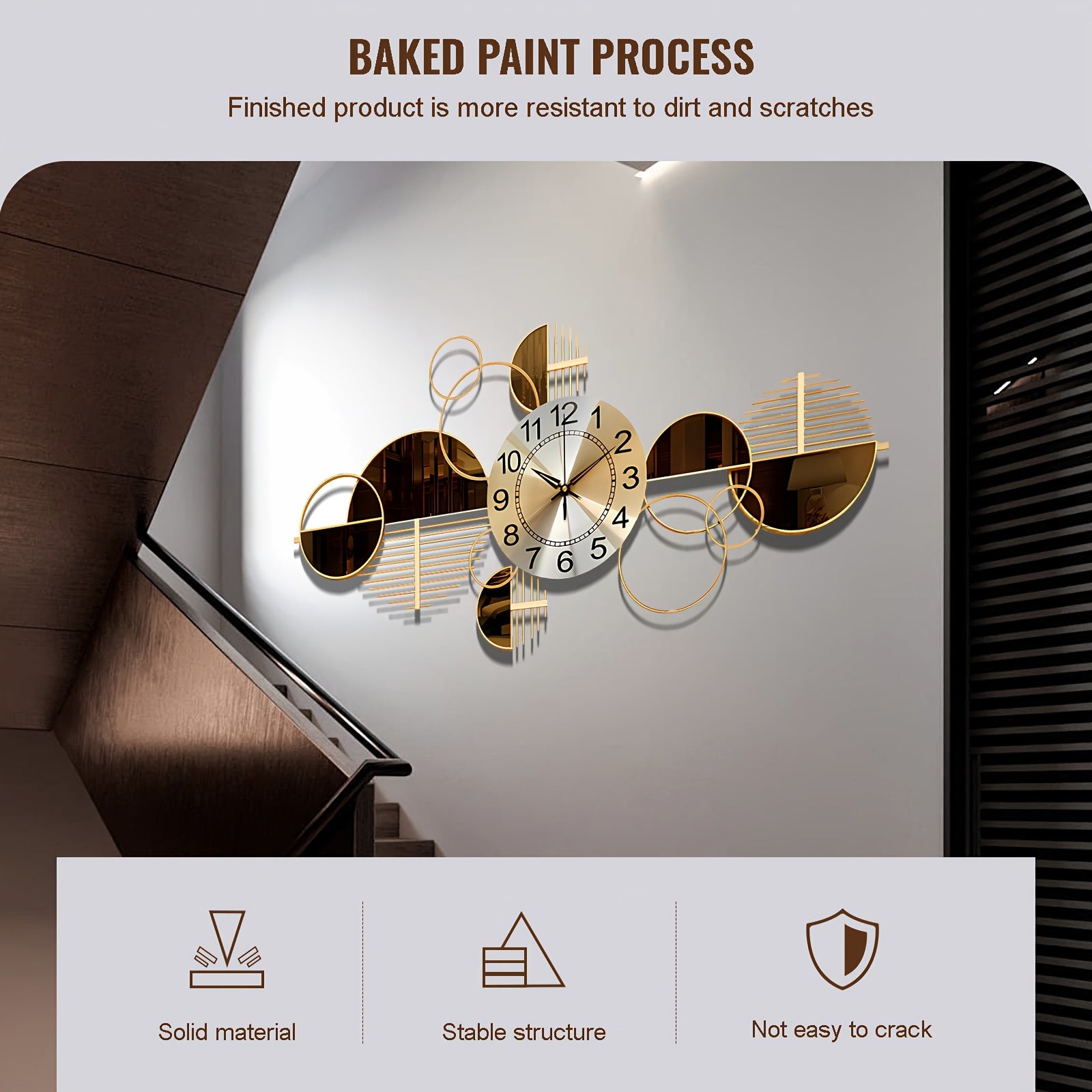 Elevate your space with the timeless elegance of our Silent Wall Clock, a striking 3D decorative piece designed to blend function with modern art. Measuring 31" x 17", this large wall clock features a bold geometric metal frame in a luxurious golden finish—perfect for making a statement in your living room, bedroom, office, or hallway.