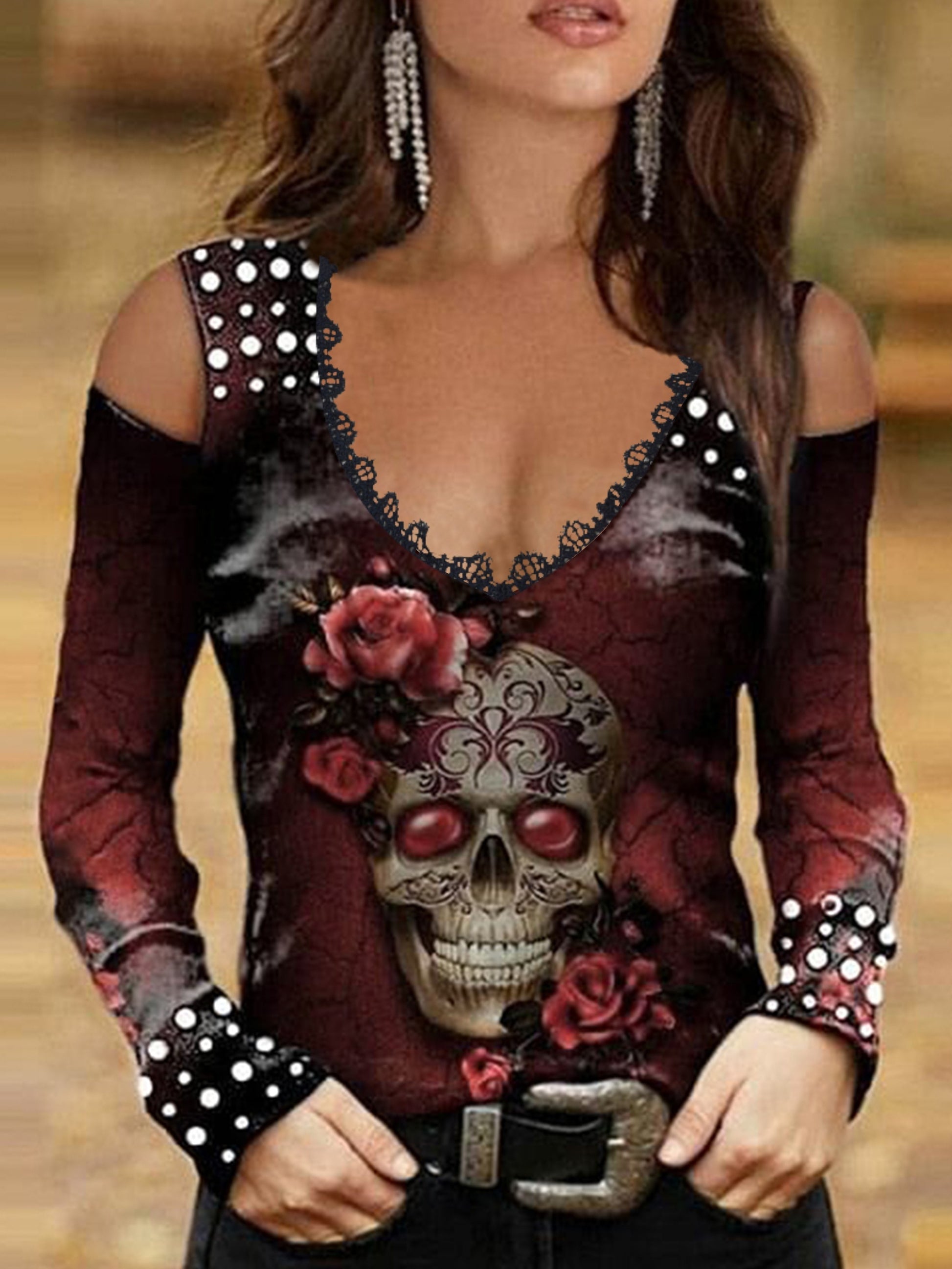 Vintage Skull Print Cold Shoulder T-Shirt – Women’s Long Sleeve Tee for Spring & Fall